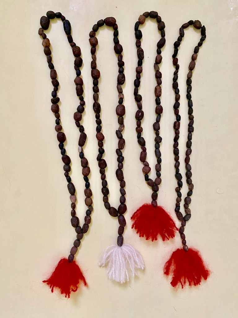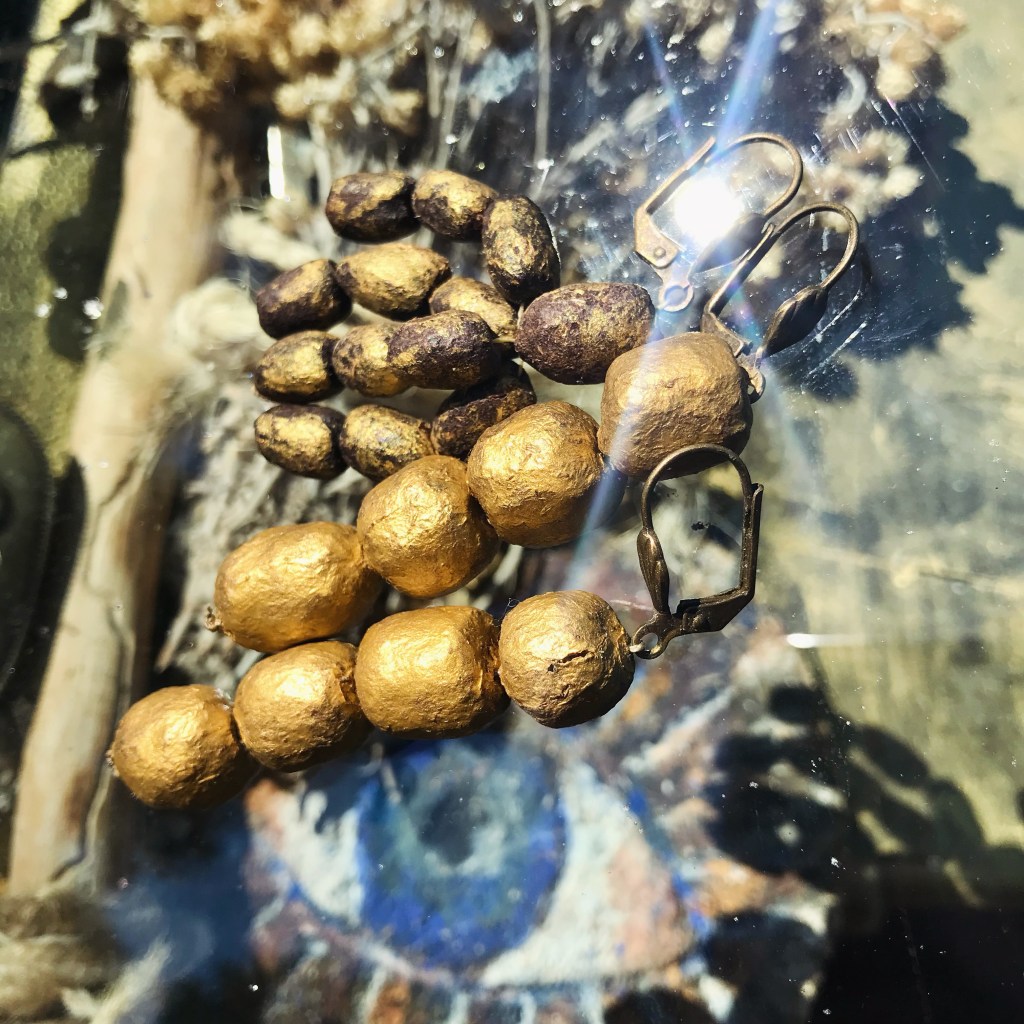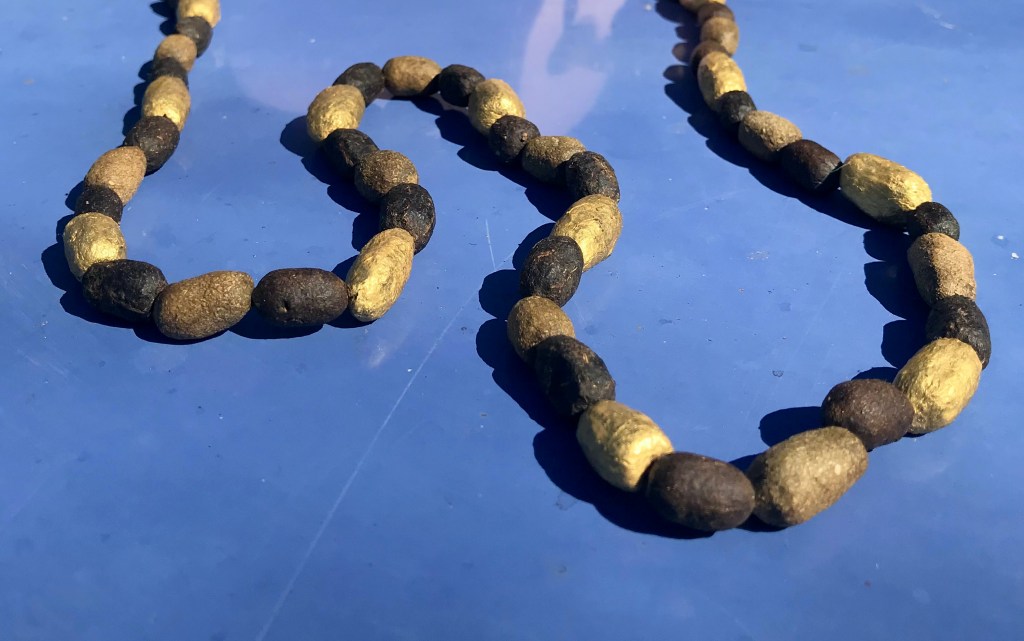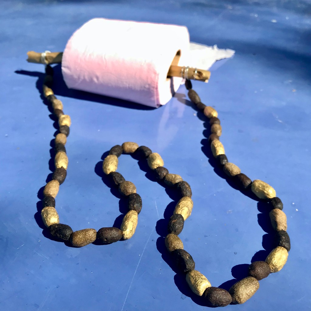Il s’agit d’un collier insolite fait en crottes d’herbivores : chèvres, chevreuils, lapins… Cet objet à la portée écologique et philosophique particulièrement puissante peut être porté autour du cou, accroché chez soi ou à son rétroviseur. L’accouchieuse se plaît à lui attribuer des vertus particulières, comme celles d’éviter les mauvaises ondes, les brûlures ou les pannes de voiture.