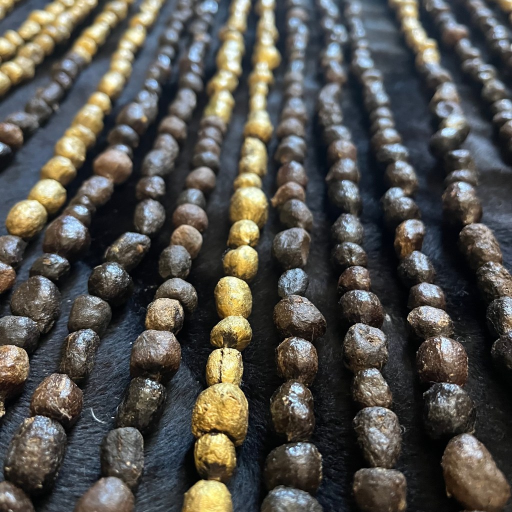 Les personnes auront l’occasion de toucher sans a priori des crottes d’herbivores sèches (les ramasser directement en ferme ou en nature si le temps et les lieux le permettent) puis les magnifier dans un espace sans jugement, confidentiel et sécurisant, en les enfilant une par une. Ce chapelet créé pourra symboliser leur résilience ou un appui matériel face à leurs émotions, leurs peurs, leurs vulnérabilités.