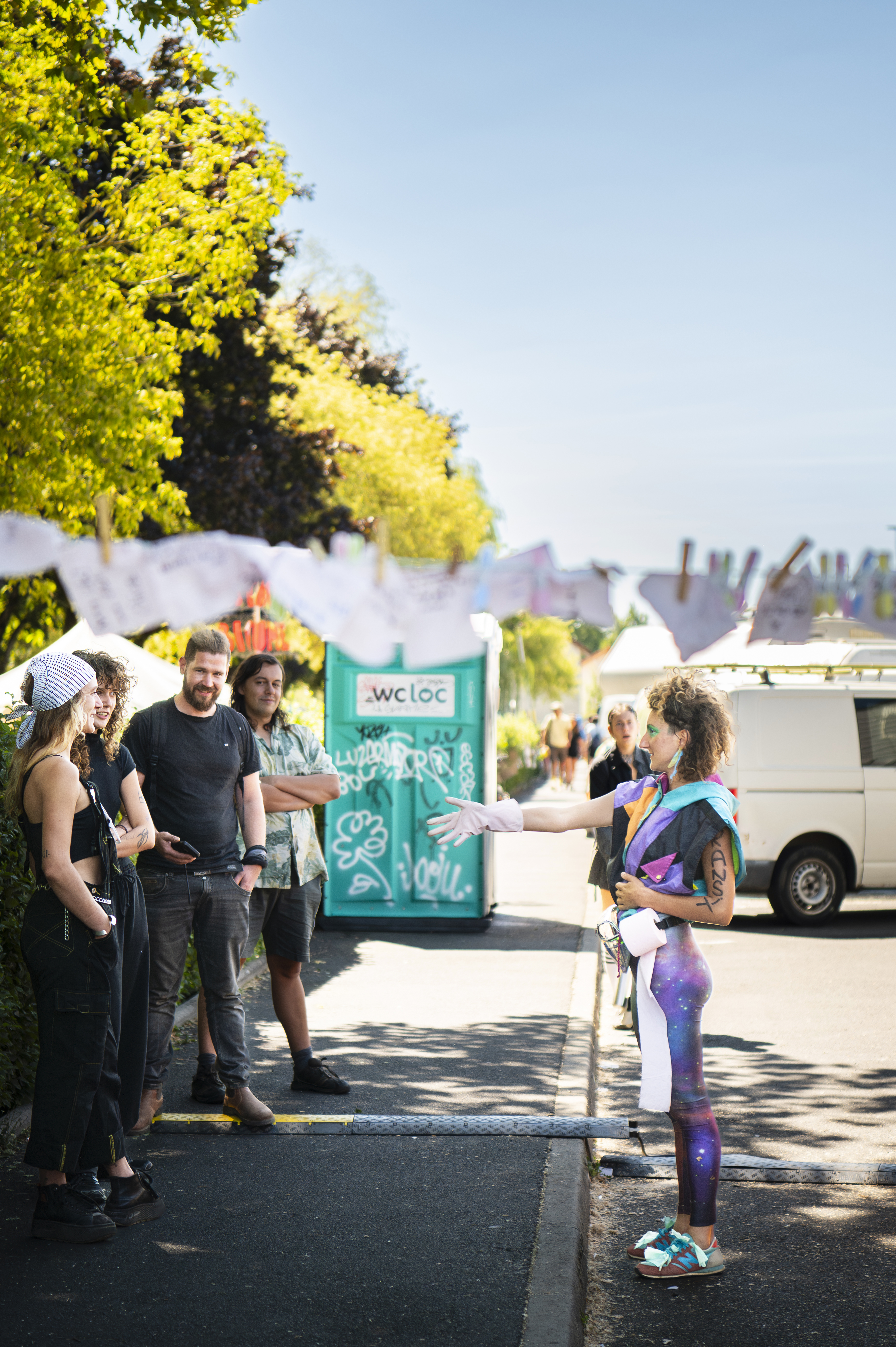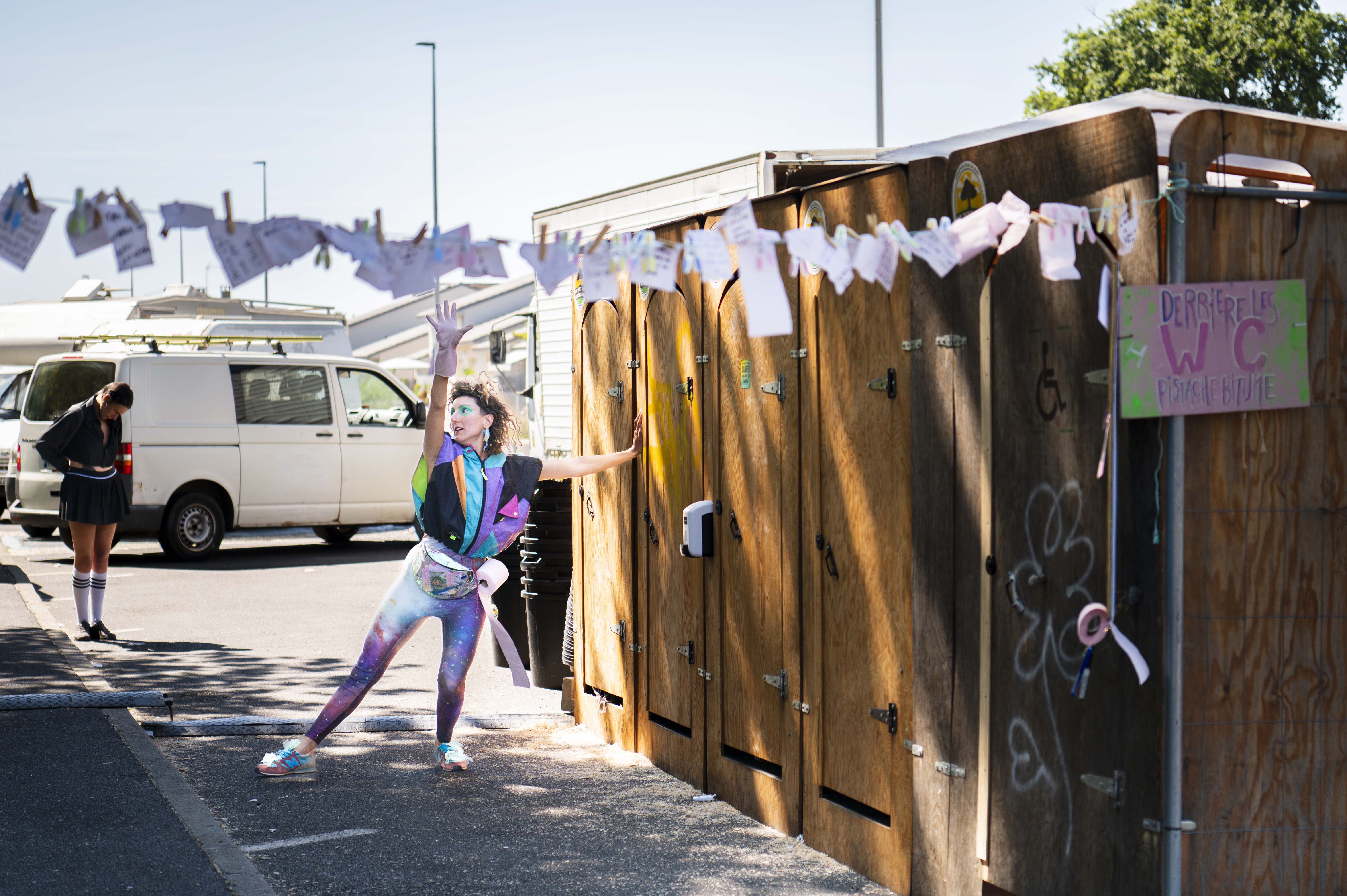Ici, l’accouchieuse publique investit les abords des sanitaires, leur file d’attente aussi, et propose par le jeu et l’interaction de dédramatiser ce moment souvent perçu comme ennuyeux, banal ou gênant. Tout en créant du lien social, elle égaye et met en lumière notre transit –physique comme émotionnel – à travers des images, échanges et sondages à la fois ludiques et sensibles, en laissant chaque personne libre d’y participer ou non.
